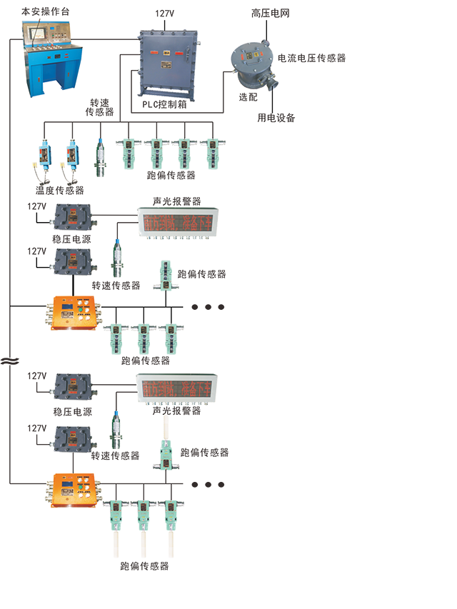 2.1.2具有機頭越位、機尾越位、上變坡掉繩、下變坡點掉繩、張緊力下降、沿線急停、沿線防脫繩、打滑保護、制動器動作失效保護及下車點提示等開關(guān)量信號采集、顯示及報警功能。