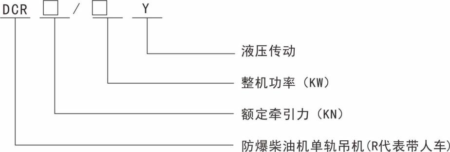 示列:型號DCR390/160Y,表示額定牽引力390KN,柴油機(jī)功率160KW,柴油機(jī)動力液壓驅(qū)動單軌吊機(jī)車。