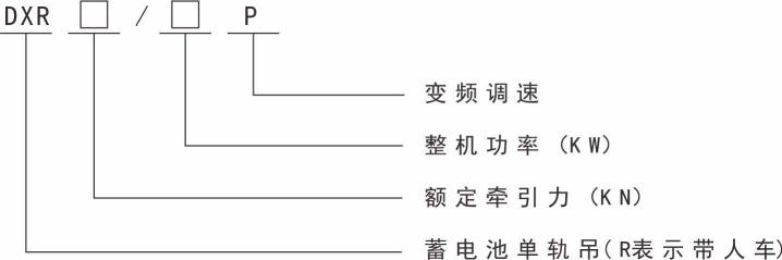 示列:型號(hào)DX120/72P表示額定牽引力120KN,整機(jī)功率72KW電機(jī)驅(qū)動(dòng)的蓄電池單軌吊機(jī)車。