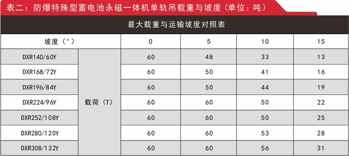 1.防爆特殊型蓄電池永磁一體機(jī)單軌吊參數(shù)及負(fù)載表