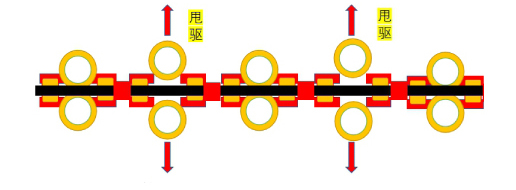 通過(guò)控制夾緊油缸松開(kāi)驅(qū)動(dòng)部上兩個(gè)夾緊在軌道上的驅(qū)動(dòng)輪以實(shí)現(xiàn)甩驅(qū),通過(guò)控制設(shè)定數(shù)量的驅(qū)動(dòng)部甩驅(qū)以減少能耗和物耗。